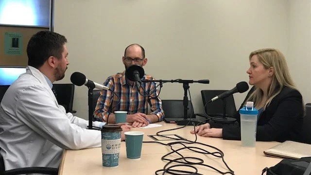 Recording with Dr. Samantha Leonard (right) and Dr. Tyler Goettl (left).